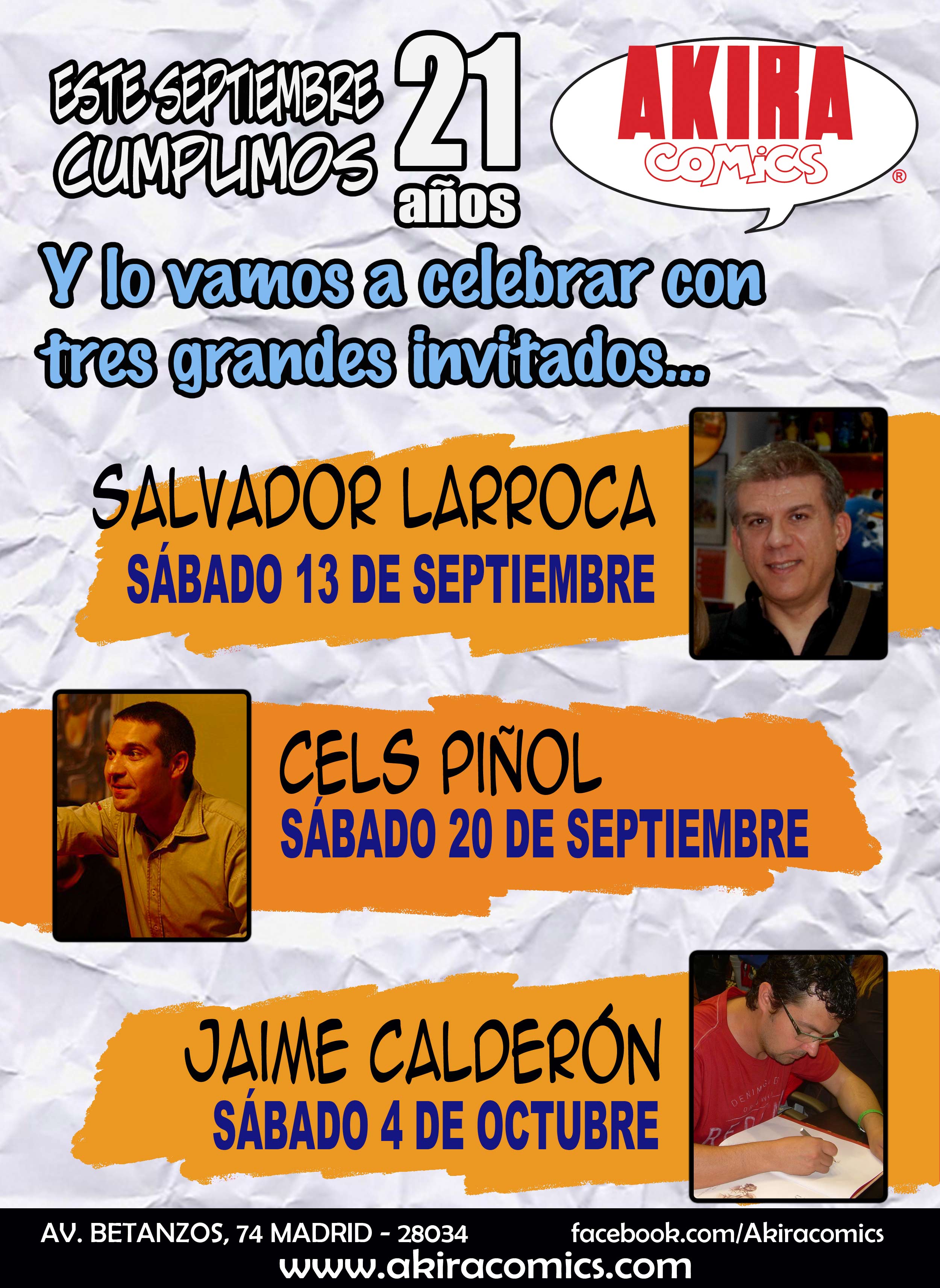 Para celebrar el 21 aniversario de la librería madrileña Akira Cómics, habrá una sesión de firmas de Salvador Larroca el 13 de Septiembre de 2014, entre las 10:00 y 14:00. Una sesión única para conseguir una firma en la edición especial del Salvaje Lobezno 40, ya a la venta, y solo disponible en Akira Cómics. Y el Sábado 20 de Septiembre, otro invitado de lujo: Cels Piñol. De poder iría encantado a por firmas de los 2.